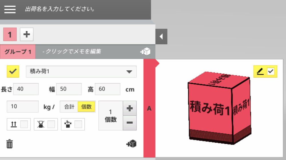 寸法、数量(個数)、重量(合計または個ごと)を入力してください。