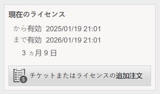 ユーザープロフィールの下にある購入フォームにアクセスするには、購入ボタンの横にある名前をクリックします。「ライセンスとチケットを追加購入」をクリックすると、簡単に行くことができます。ここでは、現在のライセンスの有効性も確認できます。