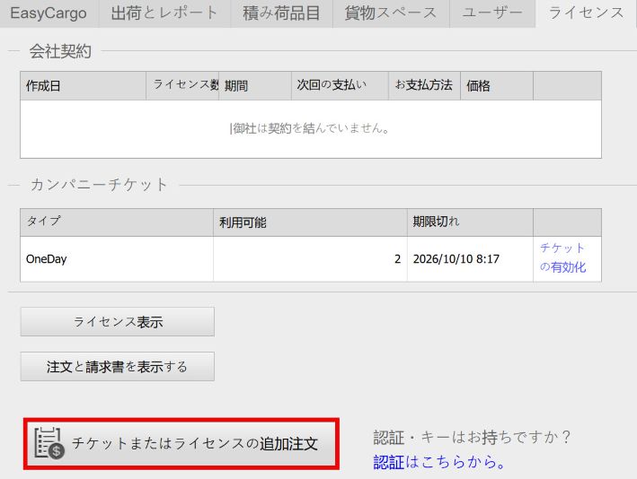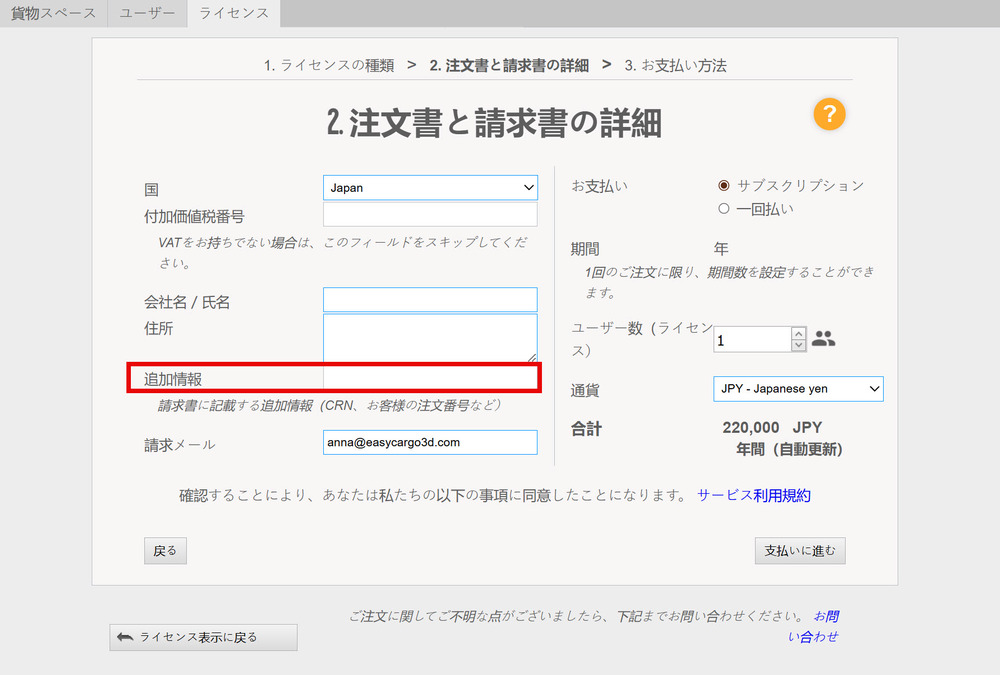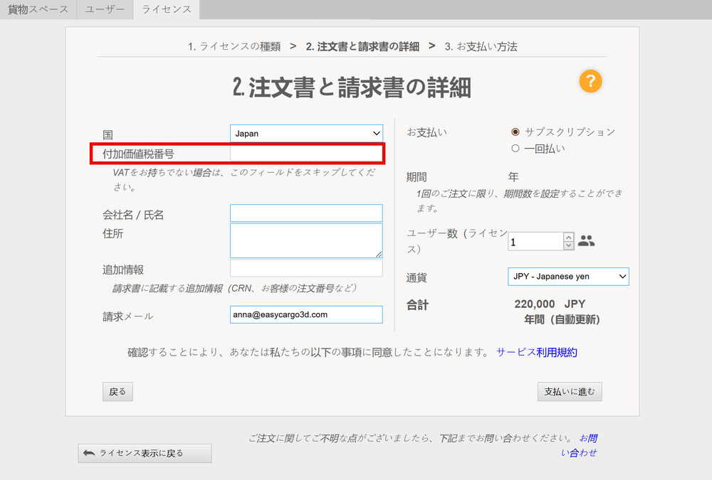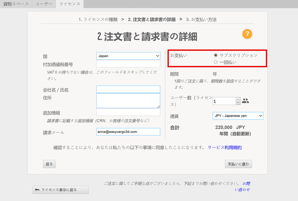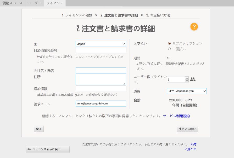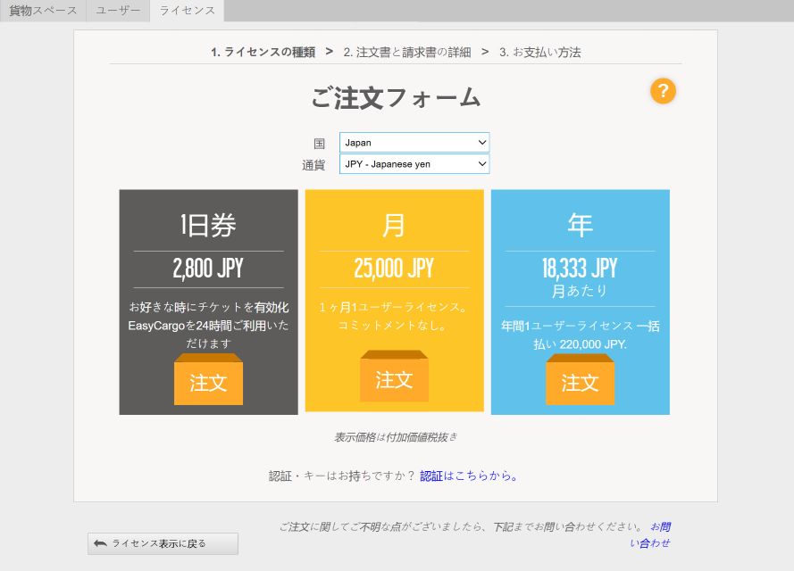 (支払いが正式に受領されるよりも早くEasyCargoの使用を開始する必要がある場合は、お問い合わせフォームからご連絡いただけ れば、支払い確認書を送信した上で、お支払いを受領する前にライセンスを事前に有効にすることができます。