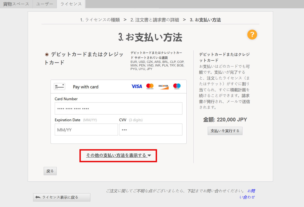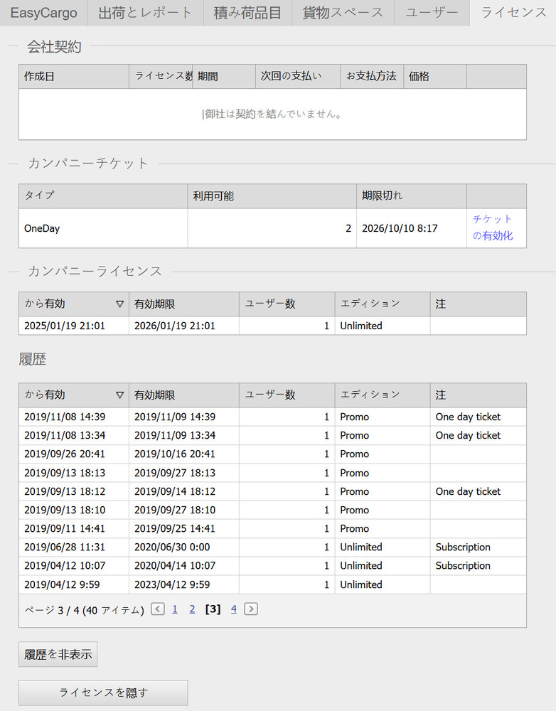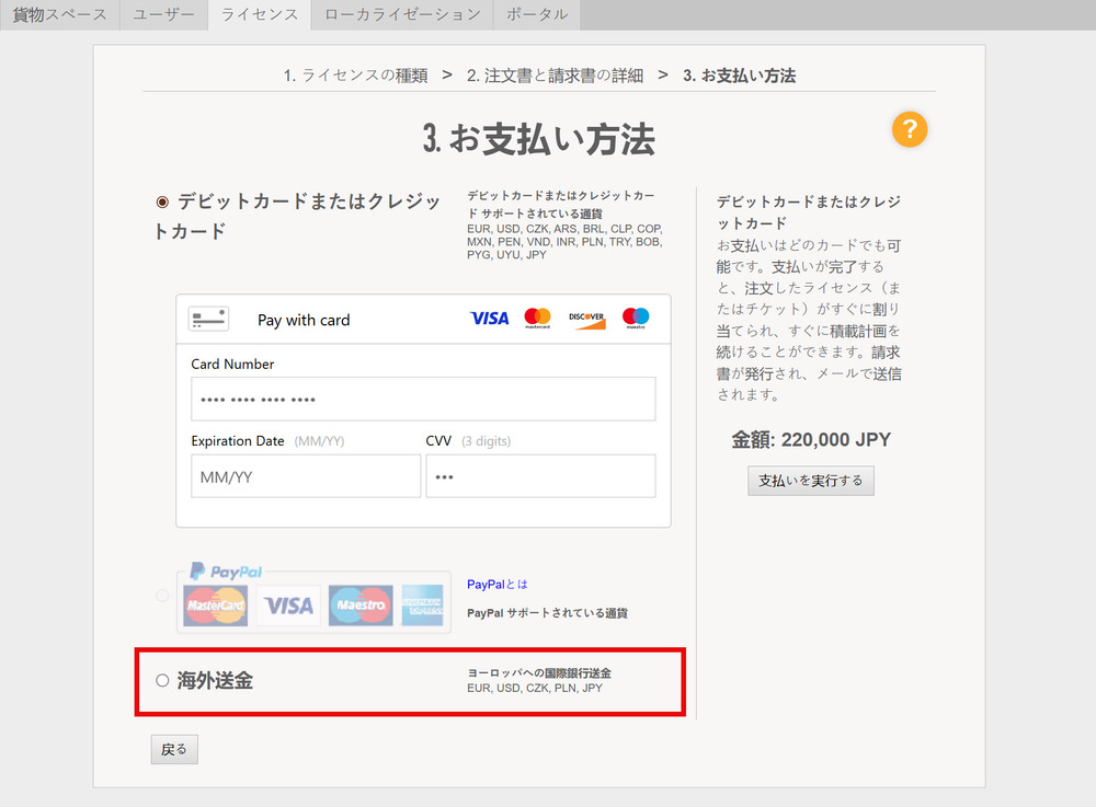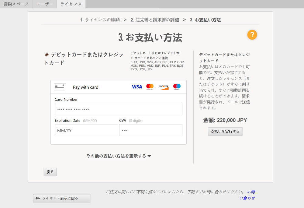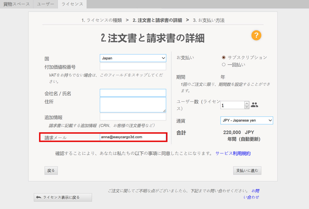 (支払いが正式に受領されるよりも早くEasyCargoの使用を開始する必要がある場合は、お問い合わせフォームからご連絡いただけ れば、支払い確認書を送信した上で、お支払いを受領する前にライセンスを事前に有効にすることができます。