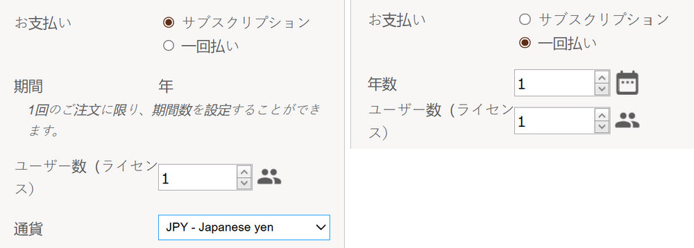 年・月 購入時は購入フォームの右上で、サブスクリプションと1回限りの購入のどちらかを選択できます。サブスクリプションは、アプリケーションを継続して使用するためのデフォルトのオプションであり、ライセンスは有効期限が切れると自動的に延長され、請求されます。 カードでお支払いの場合、今後のお支払いのお支払い方法としてカード番号が保存されます。ライセンスを自動的に延長したくない場合、または期間限定でライセンスを購入したい場合は、代わりに1回限りのオプションを選択してください。