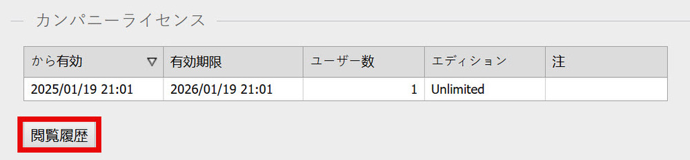 [ライセンスの表示 ]をクリックすると、現在のライセンスとその有効期間の一覧が表示されます。次のステップでは、[閲覧履歴]をクリックして、ライセンスの履歴を表示できます。